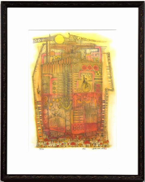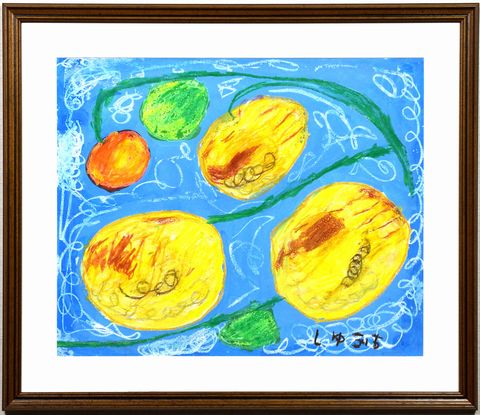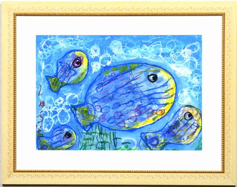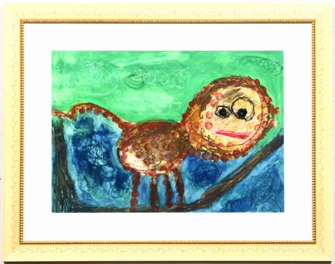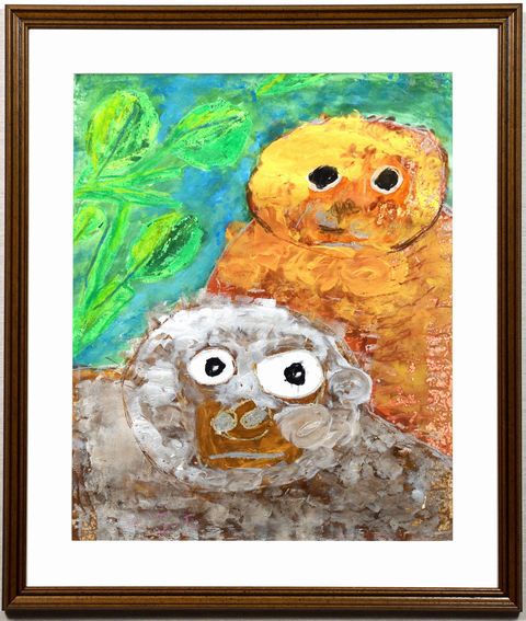 作品に出てくる人物や動物はいつもチャーミング。2人と1匹の表情から音楽を楽しんでいる雰囲気が伝わってきます。豊かな色使いと柔らかい線で、愛嬌や優しさ、温かさが溢れる1枚です。